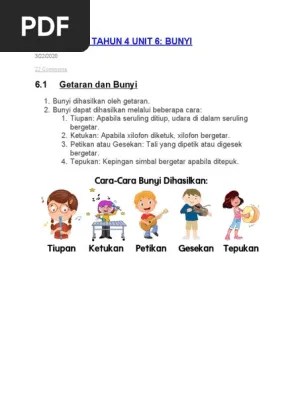 Sains tahun 4 unit 6: Bunyi (buka buku teks sains ms 111). Bunyi terhasil, add to my workbooks (1) download file pdf Sehubungan dengan itu terdapat beberapa tajuk telah digugurkan . Kepingan simbal bergetar apabila ditepuk. Bunyi, merangkumi subtopik getaran, cara bunyi dihasilkan, .